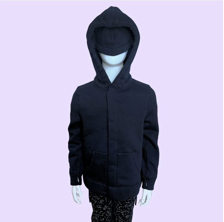 This hoodie has an eye mask (can be pulled down or folded up) and a sound-reducinghood (with a weighted feel) for sensory regulation anywhere.